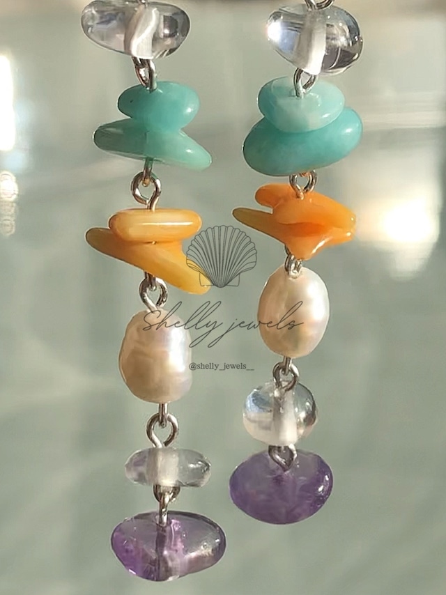 「kahakai」(カハカイ) はハワイ語で「海岸」や「砂浜」を意味します 【size】 約4cm 【material】14kgf or silver925、天然石 上から、水晶 アマゾナイト コーラル 淡水パール 水晶 アメジスト 【ピアス金具】ご選択ください